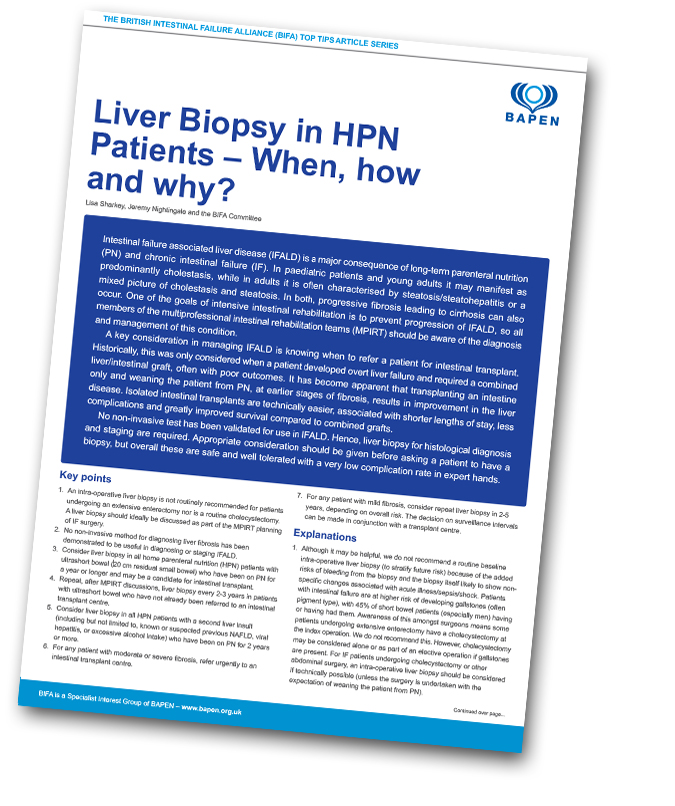 Derangement of liver function tests (LFTs) is common amongst patients receiving parenteral nutrition (PN) and is currently more common in the paediatric population. There is a broad spectrum of disease ranging from transient elevation in the liver enzymes in those receiving short-term PN, through to cirrhosis and liver failure in those who require long-term PN. The aetiology of liver disease is multifactorial, relating to both the patient and nutritional factors, and hence the term intestinal failure-associated liver disease (IFALD).