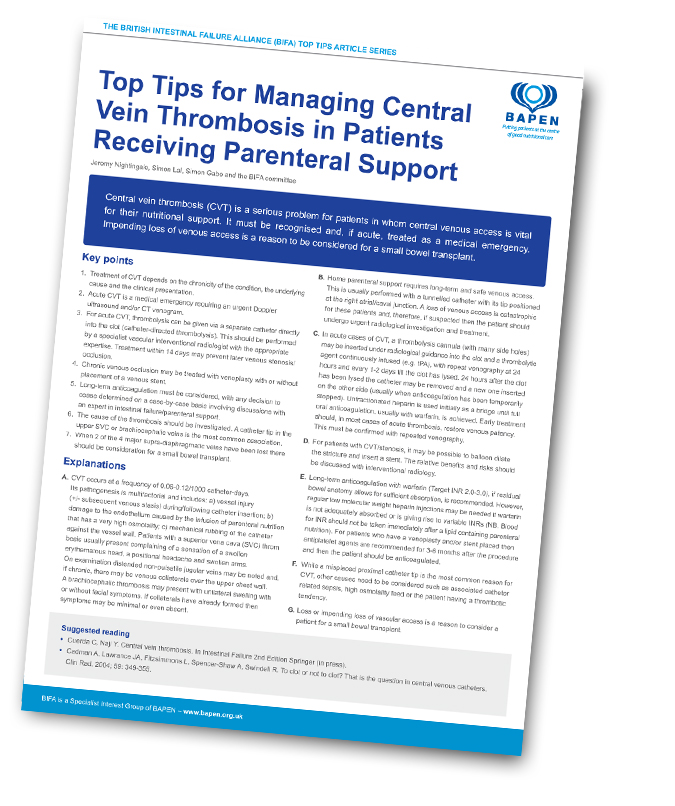 Central vein thrombosis (CVT) is a serious problem for patients in whom central venous access is vital for their nutritional support. It must be recognised and, if acute, treated as a medical emergency. Impending loss of venous access is a reason to be considered for a small bowel transplant.
