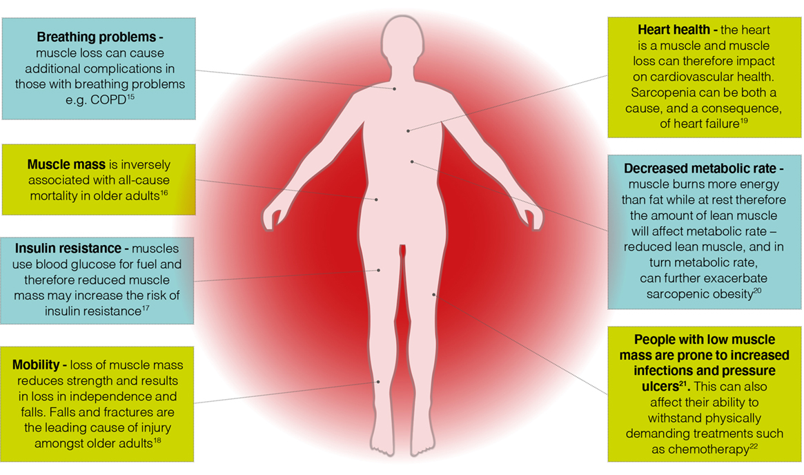 References: 1. Deutz NE, et al. (2014). Protein intake and exercise for optimal muscle function with aging: recommendations from the ESPEN Expert Group. Clin Nutr.; 33(6): 929–936. 2. Cruz-Jentoft AJ, Sayer AA (2019). Sarcopenia. Lancet; 393(10191): 2636–2646. 3. Kenny RA, Romero-Ortuno R, Kumar P (2017). Falls in older adults. Medicine; 45(1): 28–33. 4. Bozzetti F (2017). Forcing the vicious circle: sarcopenia increases toxicity, decreases response to chemotherapy and worsens with chemotherapy. Ann Oncol.; 28(9): 2107–2118. 5. Byun MK, et al. (2017). Sarcopenia correlates with systemic inflammation in COPD. Int J Chron Obstruct Pulmon Dis.; 12: 669–675. 6. Springer J, Springer JI, Anker SD (2017). Muscle wasting and sarcopenia in heart failure and beyond: update 2017. ESC Heart Fail.; 4(4): 492–498. 7. Landi F, et al. (2017). The association between sarcopenia and functional outcomes among older patients with hip fracture undergoing in-hospital rehabilitation. Osteoporos Int.; 28(5): 1569–1576.
