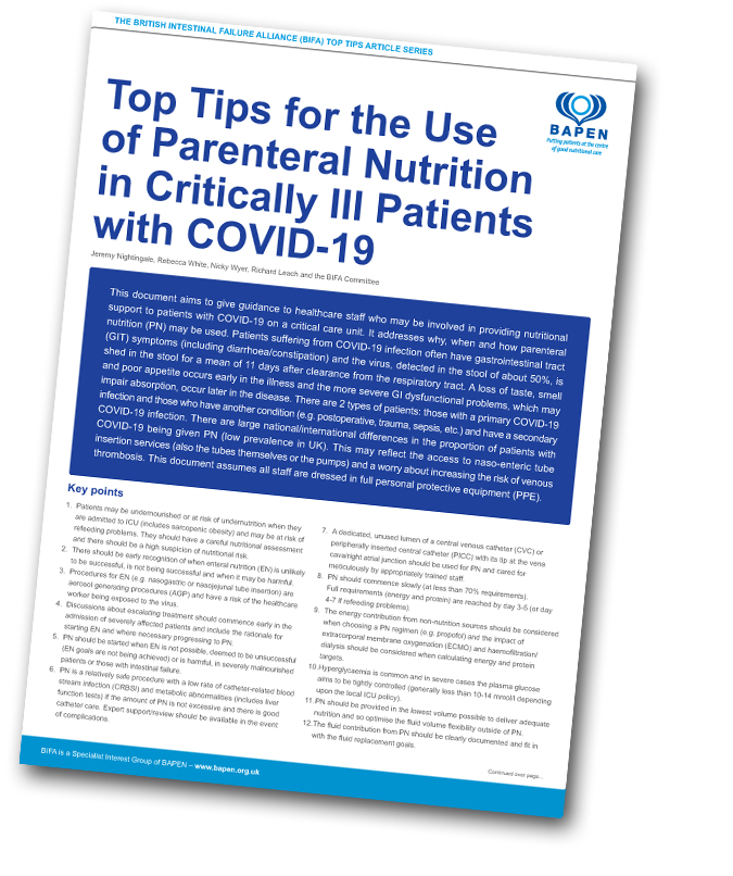 This document aims to give guidance to healthcare staff who may be involved in providing nutritional support to patients with COVID-19 on a critical care unit. It addresses why, when and how parenteral nutrition (PN) may be used. Patients suffering from COVID-19 infection often have gastrointestinal tract(GIT) symptoms (including diarrhoea/constipation) and the virus, detected in the stool of about 50%, is shed in the stool for a mean of 11 days after clearance from the respiratory tract. A loss of taste, smell and poor appetite occurs early in the illness and the more severe GI dysfunctional problems, which may impair absorption, occur later in the disease. There are 2 types of patients: those with a primary COVID-19 infection and those who have another condition (e.g. postoperative, trauma, sepsis, etc.) and have a secondary COVID-19 infection. There are large national/international differences in the proportion of patients with COVID-19 being given PN (low prevalence in UK). This may reflect the access to naso-enteric tube insertion services (also the tubes themselves or the pumps) and a worry about increasing the risk of venous thrombosis. This document assumes all staff are dressed in full personal protective equipment (PPE).