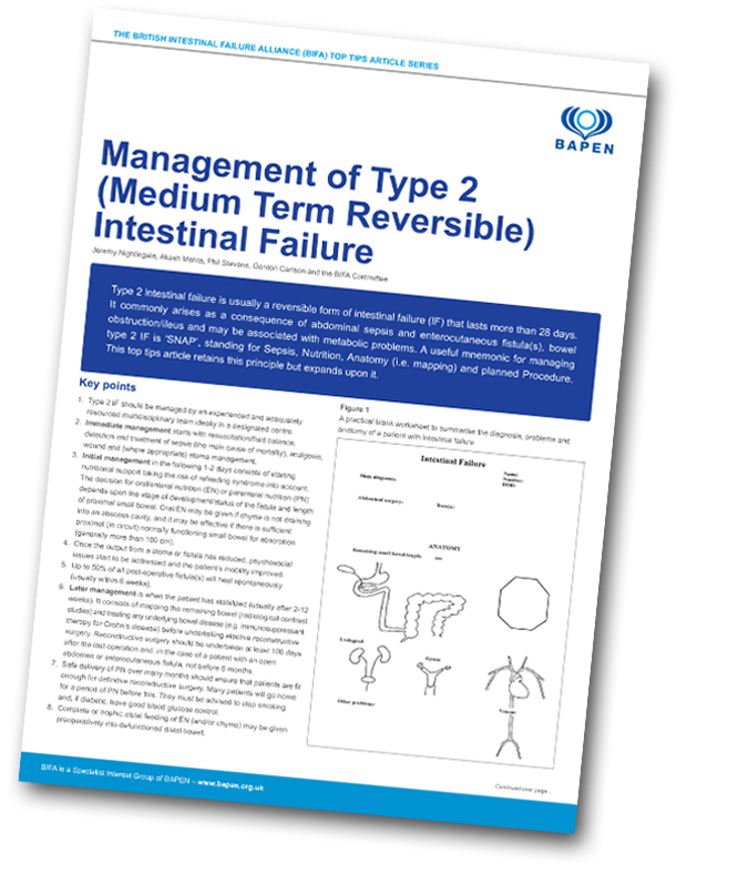 Type 2 intestinal failure is usually a reversible form of intestinal failure (IF) that lasts more than 28 days. It commonly arises as a consequence of abdominal sepsis and enterocutaneous fistula(s), bowel obstruction/ileus and may be associated with metabolic problems. A useful mnemonic for managing type 2 IF is ‘SNAP’, standing for Sepsis, Nutrition, Anatomy (i.e. mapping) and planned Procedure. This top tips article retains this principle but expands upon it.