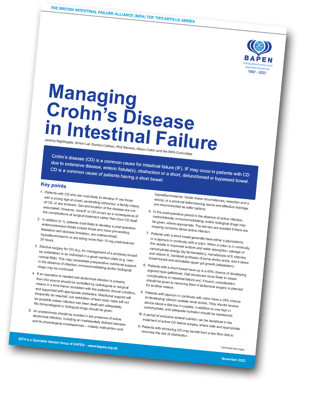 Crohn’s disease (CD) is a common cause for intestinal failure (IF). IF may occur in patients with CD due to extensive disease, enteric fistula(s), obstruction or a short, defunctioned or bypassed bowel. CD is a common cause of patients having a short bowel.