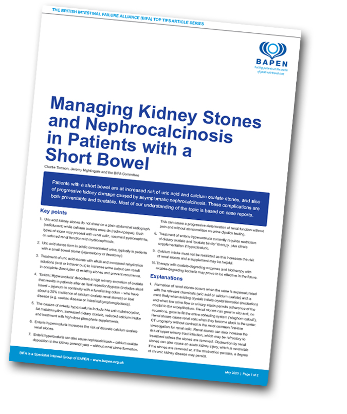 Patients with a short bowel are at increased risk of uric acid and calcium oxalate stones, and also of progressive kidney damage caused by asymptomatic nephrocalcinosis. These complications are both preventable and treatable. Most of our understanding of the topic is based on case reports.