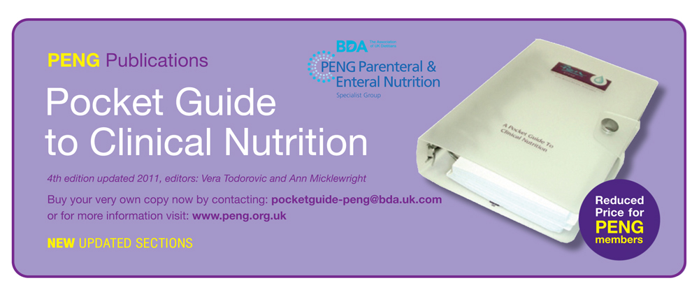 Bruno Mafrici and Vera Todorovic are leading on the updating of the PENG Pocket Guide to Clinical Nutrition, which is a big undertaking and there is exciting new research that will be shared for one of its' chapters. We are expecting the revised edition to be ready early 2018, but pre-orders will be taken at BAPEN Conference. All dietitians who are PENG members during the membership year 2017-2018 will automatically receive a revised edition as part of their 2017/18 membership year.