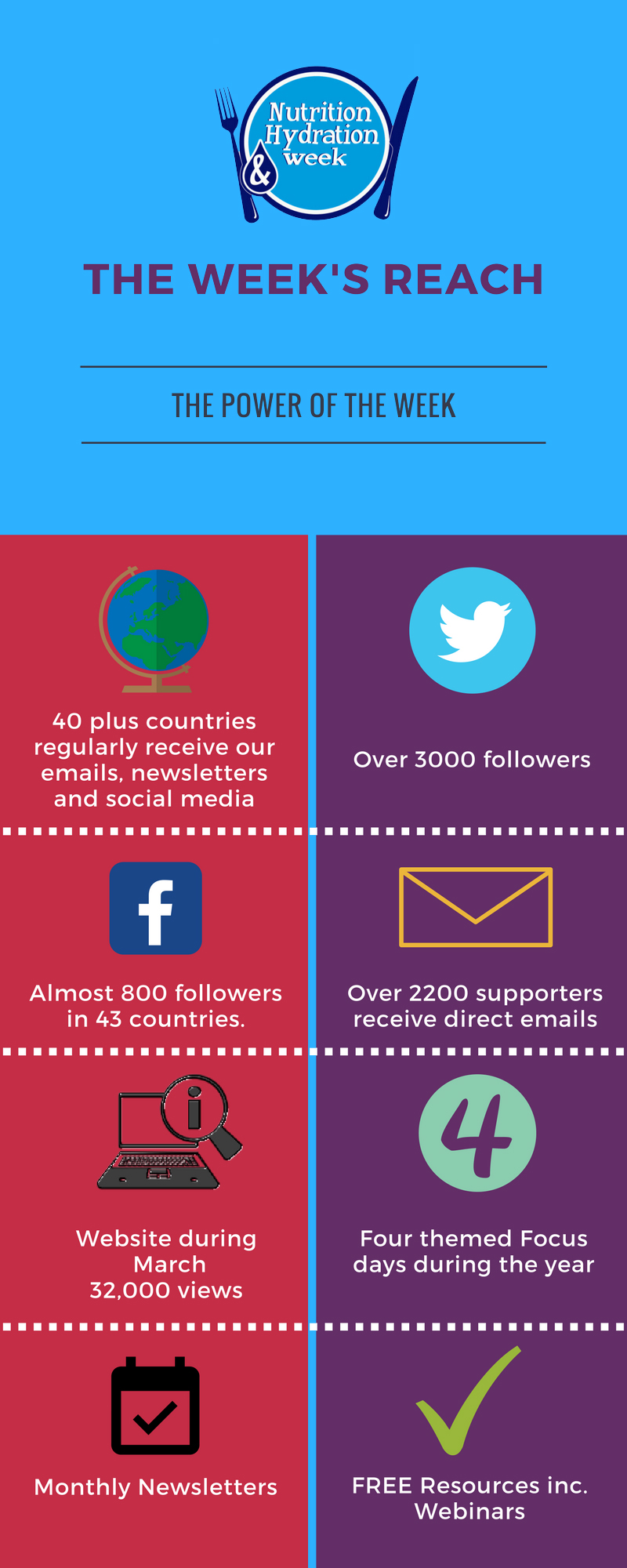 In recognition that providing good nutritional care should not, and does not, only happen for one week a year, we have added four themed focus days to the Nutrition and Hydration Week calendar. We have also had the amazing opportunity to join, free of charge, our colleagues from the Canadian Society of Nutrition Management in their series of on-line webinars providing access to learning that can contribute to our continuing professional development.