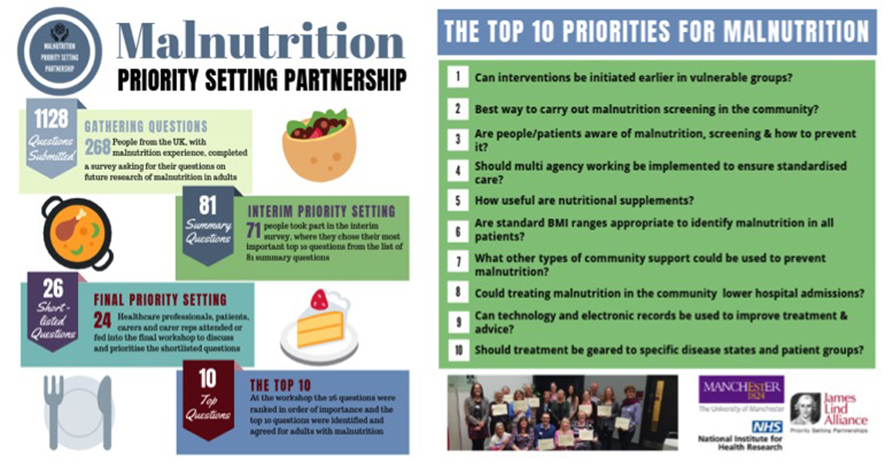 Evidence on malnutrition and nutritional screening has been developed concentrating on screening initiatives in hospital and also on evaluating clinical outcomes. There has been little involvement from patients and carers in setting the research agenda and determining the issues that are poignant in care. Healthcare professionals have been involved in setting research questions from individual perspectives but there has not been an opportunity for dietitians and professionals working in nutrition to directly contribute to setting research questions that would directly influence clinical practice. The Priority Setting Partnership (PSP) is about giving patients, carers and healthcare professionals involved in clinical practice an opportunity to influence the research agenda.