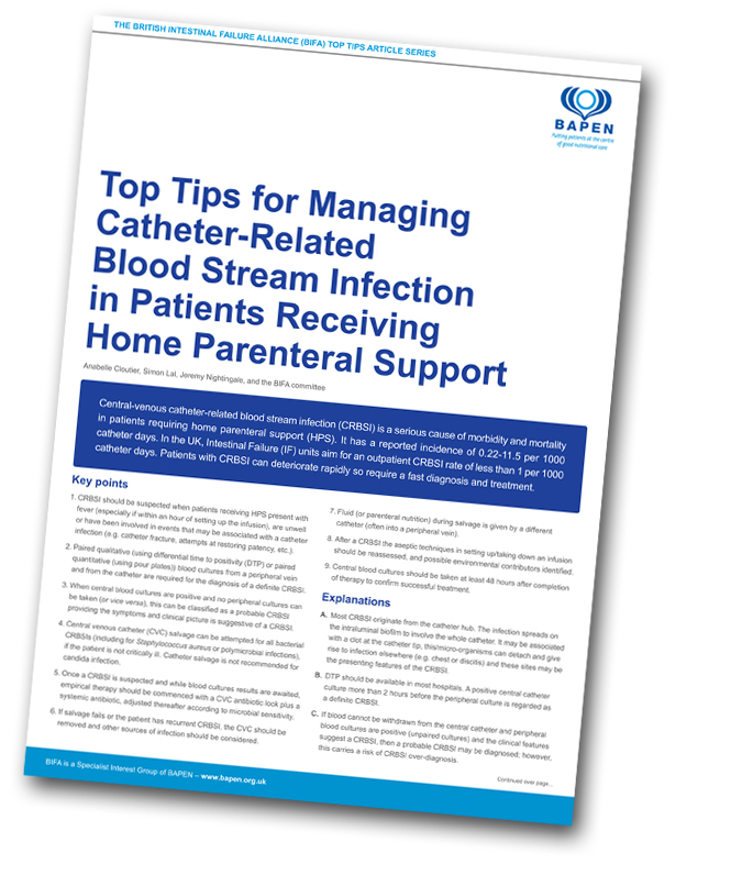 Central-venous catheter-related blood stream infection (CRBSI) is a serious cause of morbidity and mortality in patients requiring home parenteral support (HPS). It has a reported incidence of 0.22-11.5 per 1000 catheter days. In the UK, Intestinal Failure (IF) units aim for an outpatient CRBSI rate of less than 1 per 1000 catheter days. Patients with CRBSI can deteriorate rapidly so require a fast diagnosis and treatment.