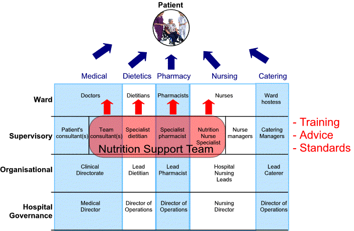 Is multi-professional and should include (at least) doctors, nutrition nurse specialist(s), dietitian(s) and pharmacist(s). It should be a role model for multi-professional working. It brings together nutritional experts from medicine/surgery, nursing, dietetics and pharmacy who can co-ordinate the contributions of each of these specialties into coherent nutritional support. It manifestly cannot do all the ward delivery of nutritional care itself, but serves to organise it and enhance it. It becomes particularly involved when there are problems requiring complex artificial nutritional support, especially parenteral nutrition. It may have a specialist role in supporting Home Parenteral Nutrition. The dietitian and pharmacist need to be senior staff and will have a supervisory role within their departments. The team’s operational focus is the safe provision of artificial nutrition but it also has a wider educational remit. It: